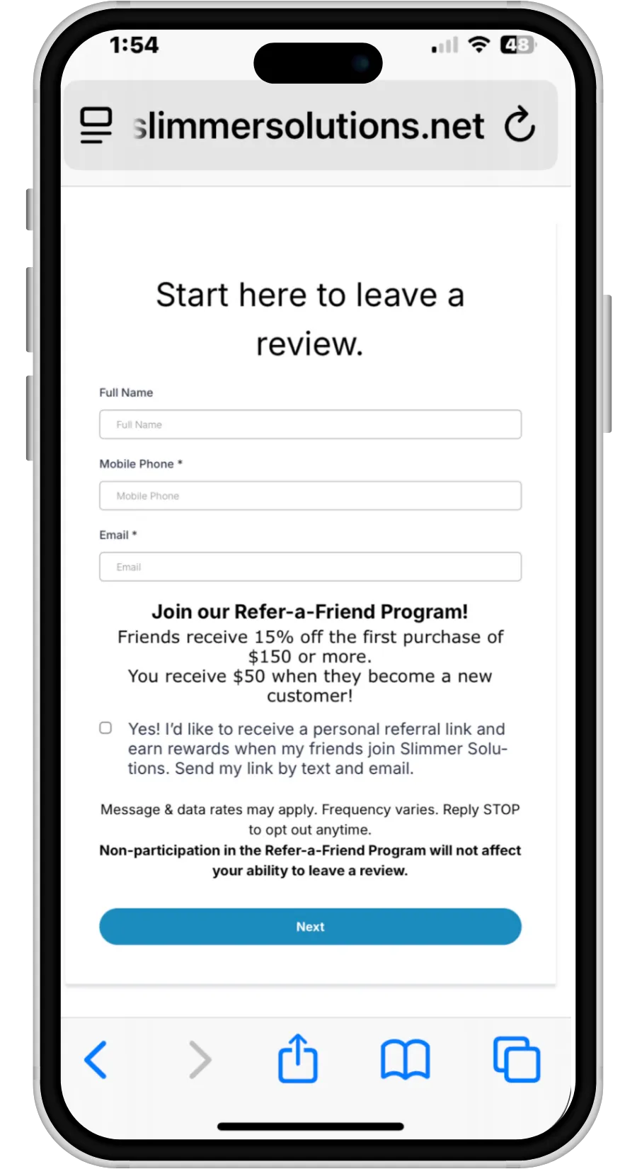Keep an eye on your text messages and email — your personal referral link will arrive shortly. When you share that link, your friends will receive PROMOTIONAL OFFER, and you’ll earn REFERRAL REWARD for each new customer you refer! We really appreciate your business and hope you will share your experience with others.”